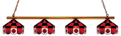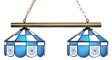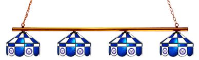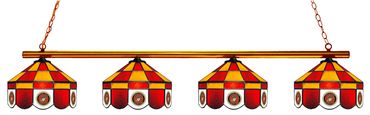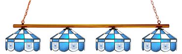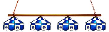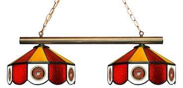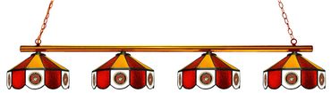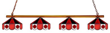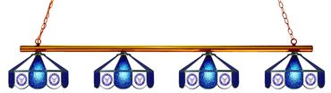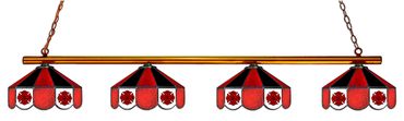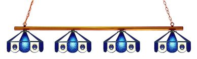 This lamp comes with four beautifully handcrafted 14” old world Tiffany style stained glass lamp shades. Heave duty Antique brass finished bar is 68” long, fully wired for direct wire with 4 UL. Approved high quality porcelain light sockets and comes with two 5’ of heave duty antique brass chain, and 6’ of wire, canopy kit ceiling Mount included. (Only one cord goes up to canopy) Handmade in the U.S.A. Light bulbs are not included. Lamp measures 74” Long X 14” Wide