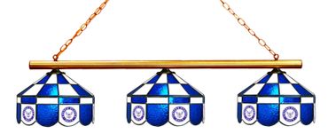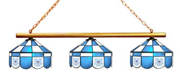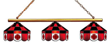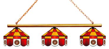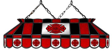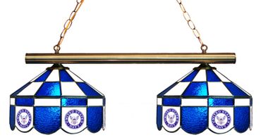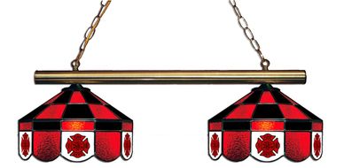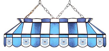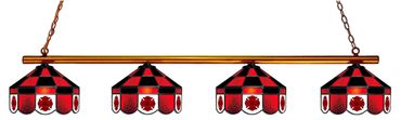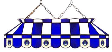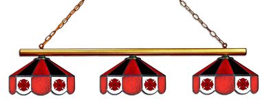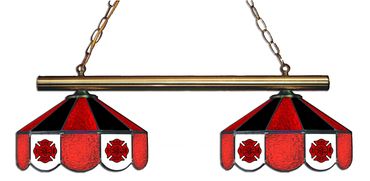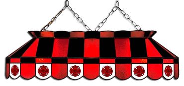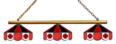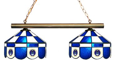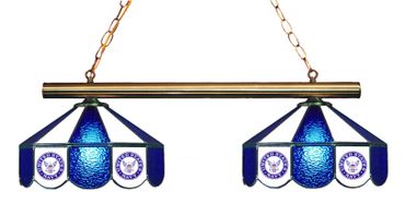 Stunning handcrafted 40” old world Tiffany style stained glass pool table billiard Light. Fully wired in line for direct wire with 3 UL. Approved high quality porcelain light sockets and two 3-1/2’ of heave duty antique brass chain (Only one cord goes up to canopy) Ceiling Mount Canopy kit included. Handmade in the U.S.A. Light bulbs not included. Lamp measures 40-1/2” Long X 16” Wide X 11-1/2” High