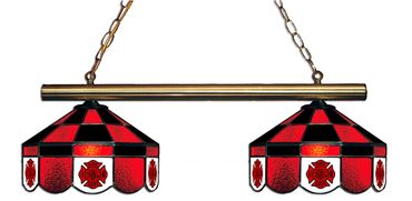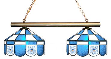 This lamp comes with two beautifully handcrafted 14” old world Tiffany style Stained glass lamp shades. Heave duty Antique brass finished bar is 28” long, fully wired for direct wire with 2 UL. Approved high quality porcelain light sockets comes with two 3’ of heave duty antique brass chain and 5’ of wire, canopy kit Ceiling mount included. (Only one cord goes up to canopy) Handmade in the U.S.A. Light bulbs are not included. Lamp measures 34” Long X 14” Wide