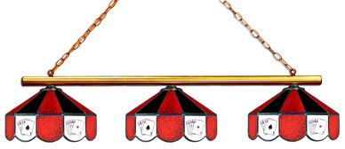 This lamp comes with three beautifully handcrafted 14” old world Tiffany style Stained glass lamp shades. Heave duty Antique brass finished bar is 48” long, fully wired for direct wire with 3 UL. Approved high quality porcelain light sockets comes with two 4’ of heave duty antique brass chain and 6’ of wire, canopy kit Ceiling mount included. (Only one cord goes up to canopy) Handmade in the U.S.A. Light bulbs are not included. Lamp measures 54” Long X 14” Wide