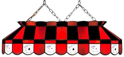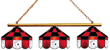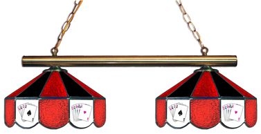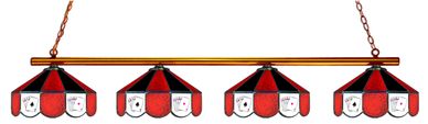 Stunning handcrafted 40” old world Tiffany style stained glass pool table billiard Light. Fully wired in line for direct wire with 3 UL. Approved high quality porcelain light sockets and two 3-1/2’ of heave duty antique brass chain (Only one cord goes up to canopy) Ceiling Mount Canopy kit included. Handmade in the U.S.A. Light bulbs not included. Lamp measures 40-1/2” Long X 16” Wide X 11-1/2” High
