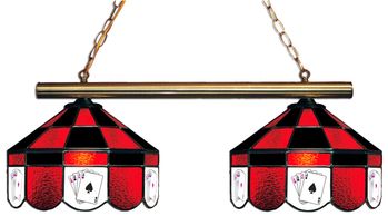 This lamp comes with two beautifully handcrafted 14” old world Tiffany style Stained glass lamp shades. Heave duty Antique brass finished bar is 28” long, fully wired for direct wire with 2 UL. Approved high quality porcelain light sockets comes with two 3’ of heave duty antique brass chain and 5’ of wire, canopy kit Ceiling mount included. (Only one cord goes up to canopy) Handmade in the U.S.A. Light bulbs are not included. Lamp measures 34” Long X 14” Wide