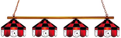 This lamp comes with four beautifully handcrafted 14” old world Tiffany style stained glass lamp shades. Heave duty Antique brass finished bar is 68” long, fully wired for direct wire with 4 UL. Approved high quality porcelain light sockets and comes with two 5’ of heave duty antique brass chain, and 6’ of wire, canopy kit ceiling Mount included. (Only one cord goes up to canopy) Handmade in the U.S.A. Light bulbs are not included. Lamp measures 74” Long X 14” Wide