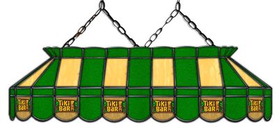 This pool table billiard game table lamp is a must have. Stunning handcrafted 40” old world Tiffany style stained glass pool table billiard light. Fully wired in line for direct wire with 3 UL. approved high quality porcelain light sockets and two 3.9’ of heavy duty antique brass chain on each side of lamp for hanging. (Only one cord goes up to canopy for wiring) Ceiling mount canopy kit included. Handmade in the U.S.A. Light bulbs not included. Lamp measures 40-1/2” Long X 16” Wide X 11-1/2” High